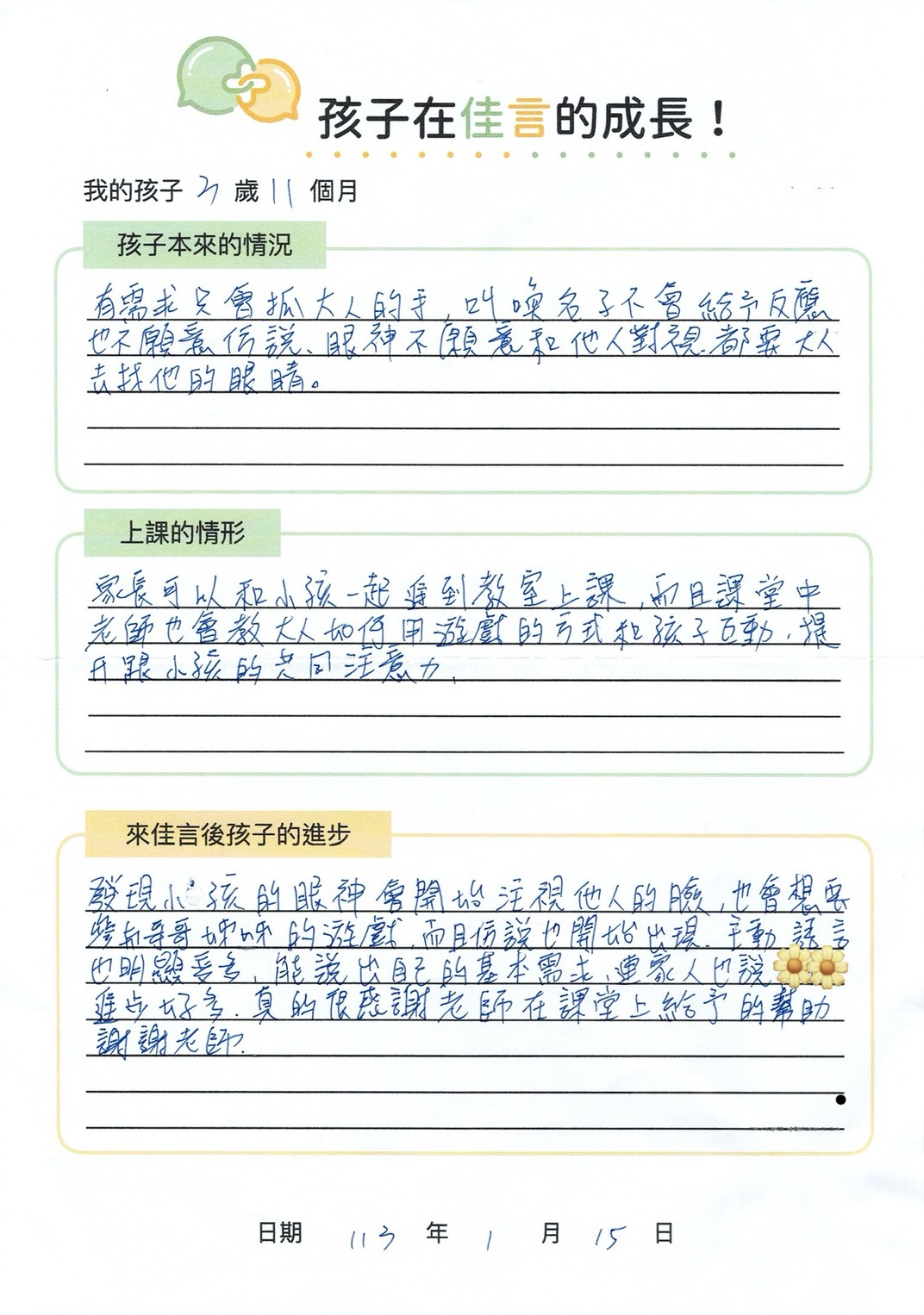 自從來佳言上課後,在何老師的專業引導和家長的共同努力下